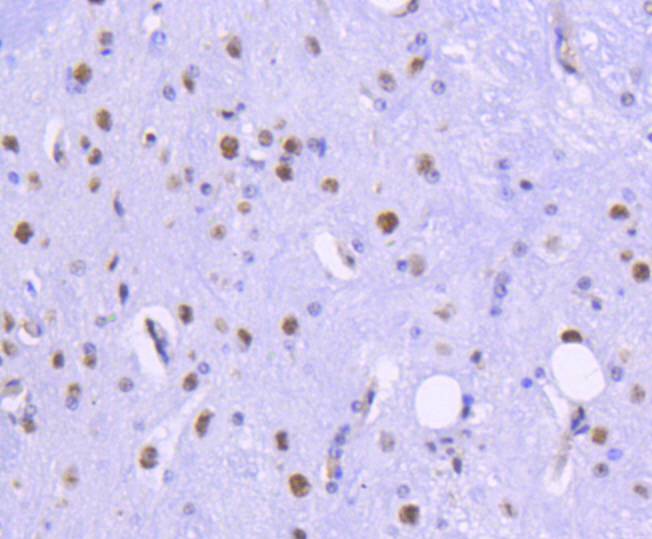 Immunohistochemical analysis of paraffin-embedded rat spinal cord tissue using anti-HDAC2 antibody. Counter stained with hematoxylin.