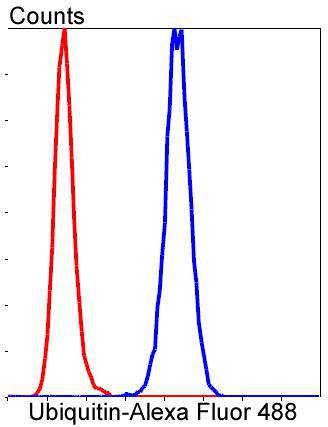 Flow cytometric analysis of HepG2 cells with Ubiquitin antibody at 1/50 dilution (blue) compared with an unlabelled control (cells without incubation with primary antibody; red). Alexa Fluor 488-conjugated goat anti rabbit IgG was used as the secondary antibody.