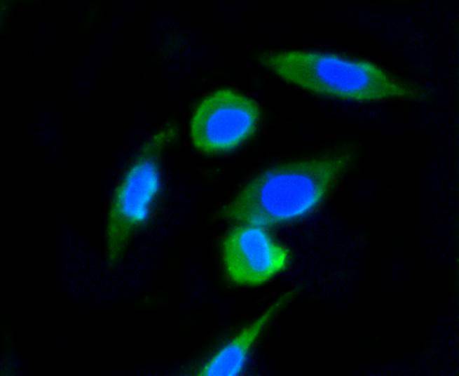 ICC staining Ubiquitin in MCF-7 cells (green). The nuclear counter stain is DAPI (blue). Cells were fixed in paraformaldehyde, permeabilised with 0.25% Triton X100/PBS.