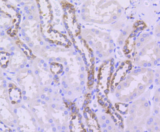 Immunohistochemical analysis of paraffin-embedded human kidney tissue using anti-beta II Tubulin antibody. Counter stained with hematoxylin.