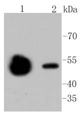 Western blot analysis of beta II Tubulin on different lysates using anti-beta II Tubulin antibody at 1/1,000 dilution. Positive control: Lane 1: Mouse brain Lane 2: Mouse kidney