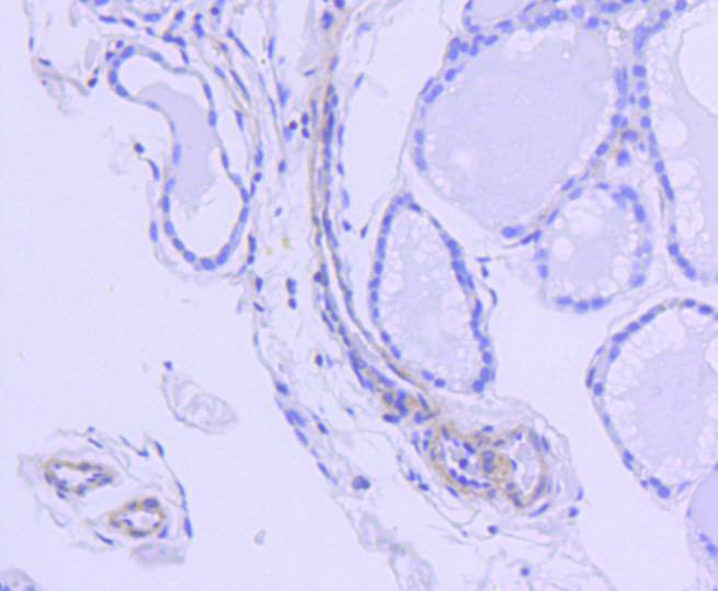 Immunohistochemical analysis of paraffin-embedded mouse thyroid tissue using anti-ROCK1 antibody. Counter stained with hematoxylin.