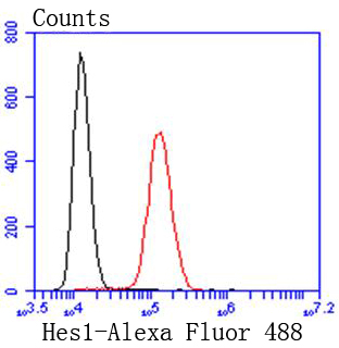 Flow cytometric analysis of sh-sy-5y cells with Hes1 antibody at 1/50 dilution (red) compared with an unlabelled control (cells without incubation with primary antibody; black). Alexa Fluor 488-conjugated goat anti rabbit IgG was used as the secondary antibody.