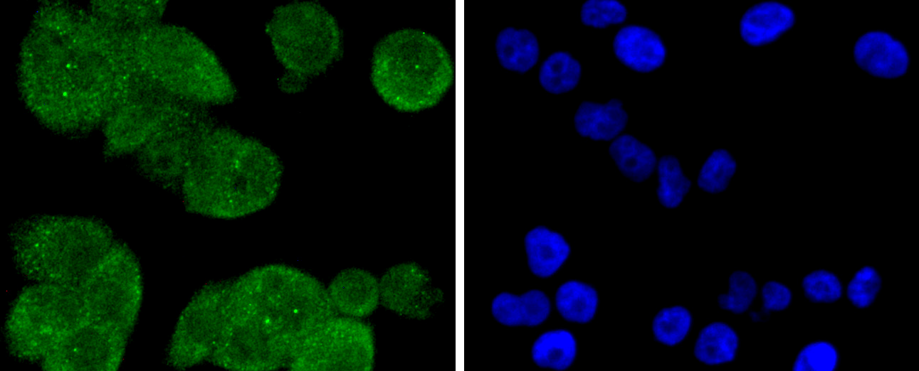 ICC staining PP2A alpha + beta in PANC-1 cells (green). The nuclear counter stain is DAPI (blue). Cells were fixed in paraformaldehyde, permeabilised with 0.25% Triton X100/PBS.