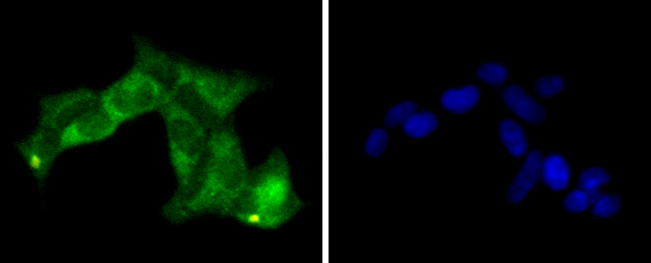 ICC staining PP2A alpha + beta in 293 cells (green). The nuclear counter stain is DAPI (blue). Cells were fixed in paraformaldehyde, permeabilised with 0.25% Triton X100/PBS.