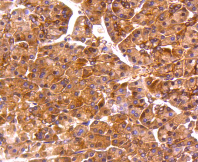 Immunohistochemical analysis of paraffin-embedded mouse stomach tissue using anti-PP2A alpha + beta antibody. Counter stained with hematoxylin.
