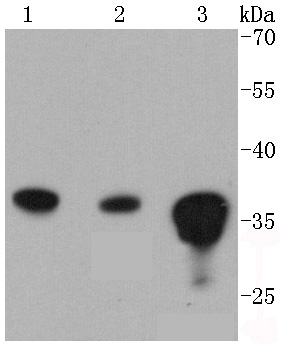 Western blot analysis of PP2A alpha + beta on different lysates using anti-PP2A alpha + beta antibody at 1/1,000 dilution. Positive control: