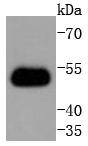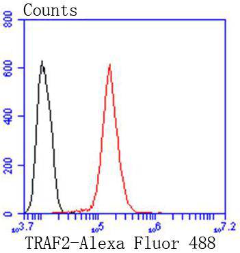 Flow cytometric analysis of Hela cells with TRAF2 antibody at 1/50 dilution (red) compared with an unlabelled control (cells without incubation with primary antibody; black). Alexa Fluor 488-conjugated goat anti rabbit IgG was used as the secondary antibody.