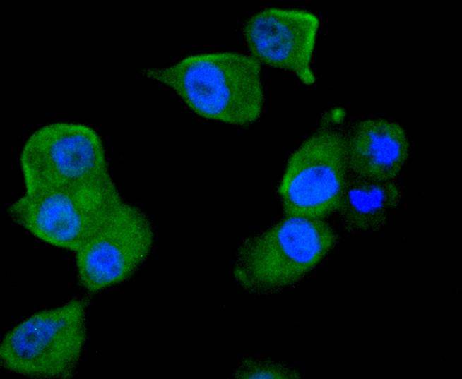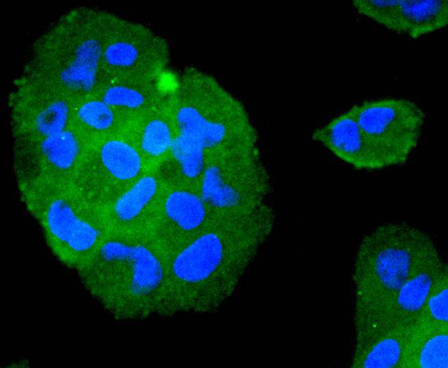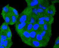 ICC staining TRAF2 in PANC-1 cells (green). The nuclear counter stain is DAPI (blue). Cells were fixed in paraformaldehyde, permeabilised with 0.25% Triton X100/PBS.