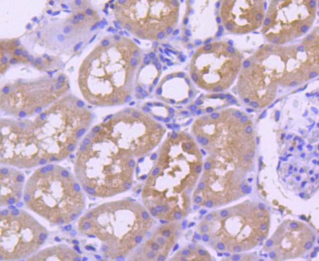 Immunohistochemical analysis of paraffin-embedded human kidney tissue using anti-TRAF2 antibody. Counter stained with hematoxylin.