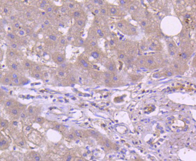 Immunohistochemical analysis of paraffin-embedded human liver tissue using anti-TRAF2 antibody. Counter stained with hematoxylin.