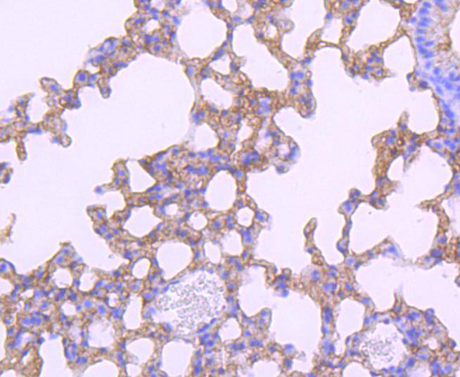 Immunohistochemical analysis of paraffin-embedded mouse lung tissue using anti-PD-L1 antibody. Counter stained with hematoxylin.