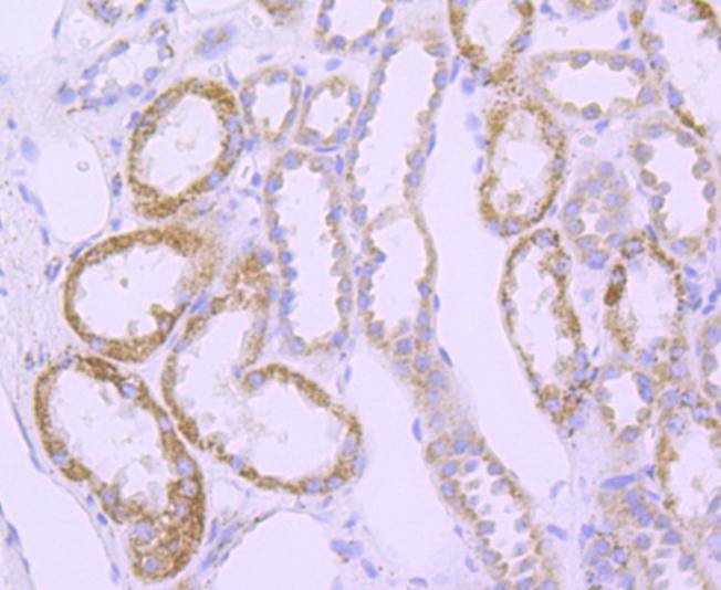Immunohistochemical analysis of paraffin-embedded human kidney tissue using anti-SOD2 antibody. Counter stained with hematoxylin.