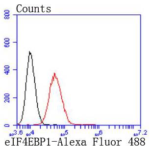Flow cytometric analysis of NIH/3T3 cells with eIF4EBP1 antibody at 1/50 dilution (red) compared with an unlabelled control (cells without incubation with primary antibody; black). Alexa Fluor 488-conjugated goat anti rabbit IgG was used as the secondary antibody
