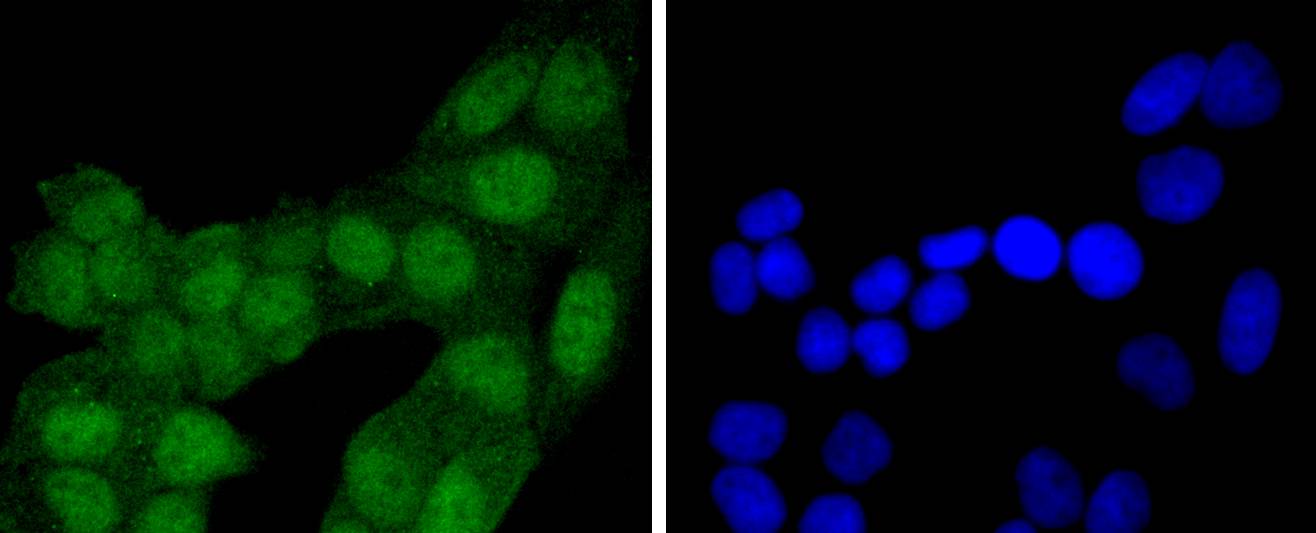 ICC staining eIF4EBP1 in MCF-7 cells (green). The nuclear counter stain is DAPI (blue). Cells were fixed in paraformaldehyde, permeabilised with 0.25% Triton X100/PBS.