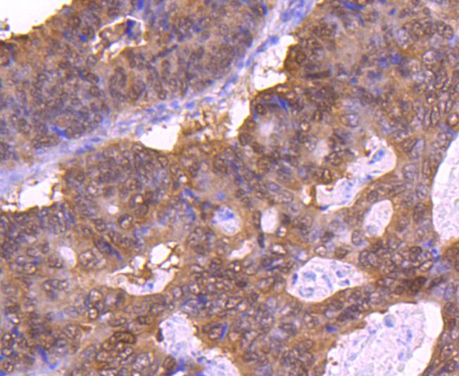 Immunohistochemical analysis of paraffin-embedded human colon cancer tissue using anti-eIF4EBP1 antibody. Counter stained with hematoxylin.