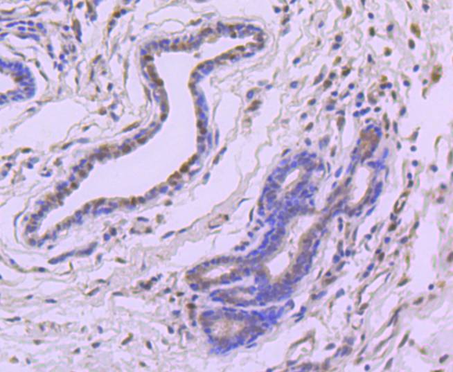 Immunohistochemical analysis of paraffin-embedded human breast carcinoma tissue using anti-eIF4EBP1 antibody. Counter stained with hematoxylin.