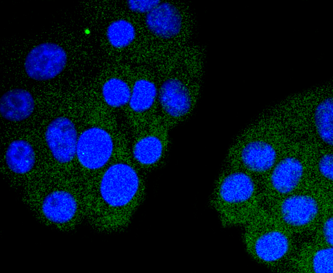 ICC staining Troponin I in HepG2 cells (red). The nuclear counter stain is DAPI (blue). Cells were fixed in paraformaldehyde, permeabilised with 0.25% Triton X100/PBS.