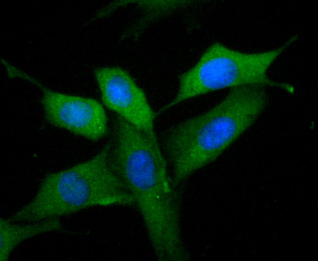 ICC staining MMP9 in SHG-44 cells (green). The nuclear counter stain is DAPI (blue). Cells were fixed in paraformaldehyde, permeabilised with 0.25% Triton X100/PBS.