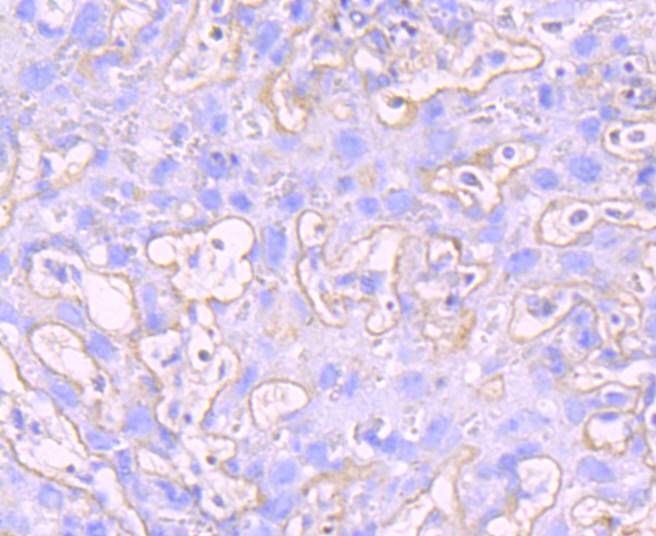 Immunohistochemical analysis of paraffin-embedded mouse placenta tissue using anti-MMP9 antibody. Counter stained with hematoxylin.