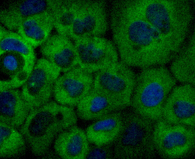 ICC staining NFkB p100 in A431 cells (green). The nuclear counter stain is DAPI (blue). Cells were fixed in paraformaldehyde, permeabilised with 0.25% Triton X100/PBS.