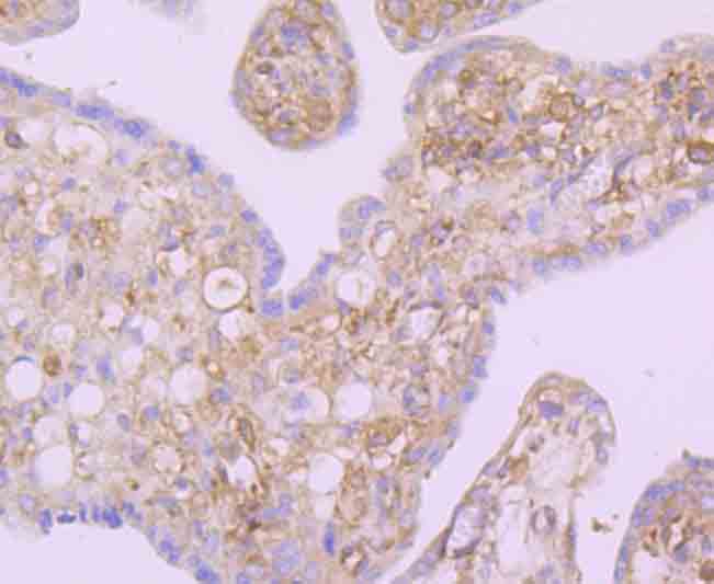 Immunohistochemical analysis of paraffin-embedded human placenta tissue using anti-NFkB p100 antibody. Counter stained with hematoxylin.