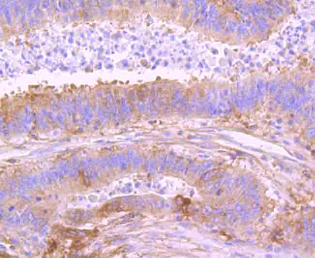 Immunohistochemical analysis of paraffin-embedded human colon cancer tissue using anti-NFkB p100 antibody. Counter stained with hematoxylin.