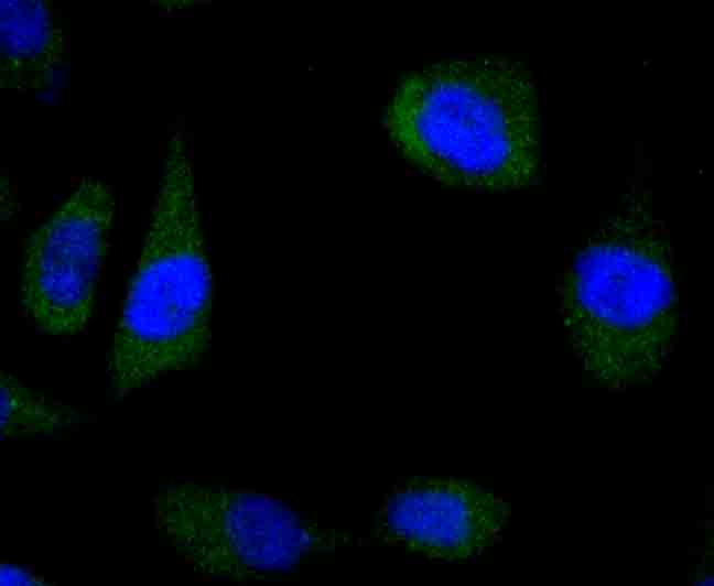 ICC staining Wnt5a in PC-3M cells (green). The nuclear counter stain is DAPI (blue). Cells were fixed in paraformaldehyde, permeabilised with 0.25% Triton X100/PBS.
