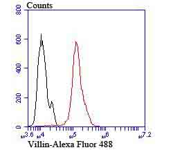 Flow cytometric analysis of Hela cells with Villin1 antibody at 1/100 dilution (red) compared with an unlabelled control (cells without incubation with primary antibody; black). Alexa Fluor 488-conjugated goat anti rabbit IgG was used as the secondary antibody.