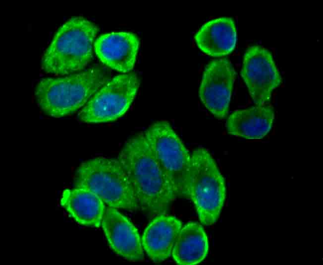 ICC staining Villin1 in HepG2 cells (green). The nuclear counter stain is DAPI (blue). Cells were fixed in paraformaldehyde, permeabilised with 0.25% Triton X100/PBS.
