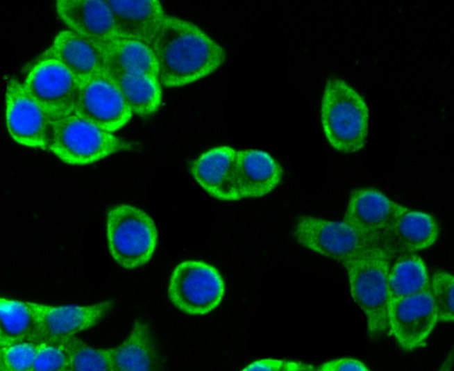 ICC staining Villin1 in LOVO cells (green). The nuclear counter stain is DAPI (blue). Cells were fixed in paraformaldehyde, permeabilised with 0.25% Triton X100/PBS.