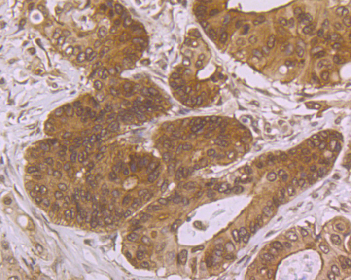 Immunohistochemical analysis of paraffin-embedded human colon cancer tissue using anti-Villin1 antibody. Counter stained with hematoxylin.