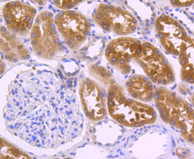 Immunohistochemical analysis of paraffin-embedded human kidney tissue using anti-Villin1 antibody. Counter stained with hematoxylin.