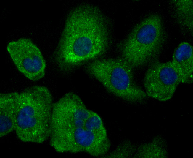 ICC staining SCGB1A1 in A431 cells (green). The nuclear counter stain is DAPI (blue). Cells were fixed in paraformaldehyde, permeabilised with 0.25% Triton X100/PBS.