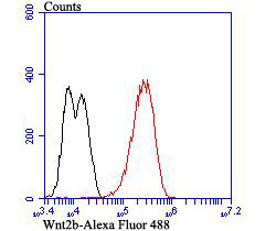 Flow cytometric analysis of LOVO cells with Wnt2b antibody at 1/50 dilution (red) compared with an unlabelled control (cells without incubation with primary antibody; black). Alexa Fluor 488-conjugated goat anti-rabbit IgG was used as the secondary antibody.