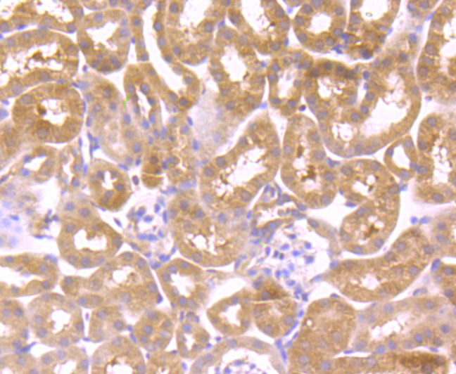 Immunohistochemical analysis of paraffin-embedded mouse kidney tissue using anti-Wnt2b antibody. Counter stained with hematoxylin.