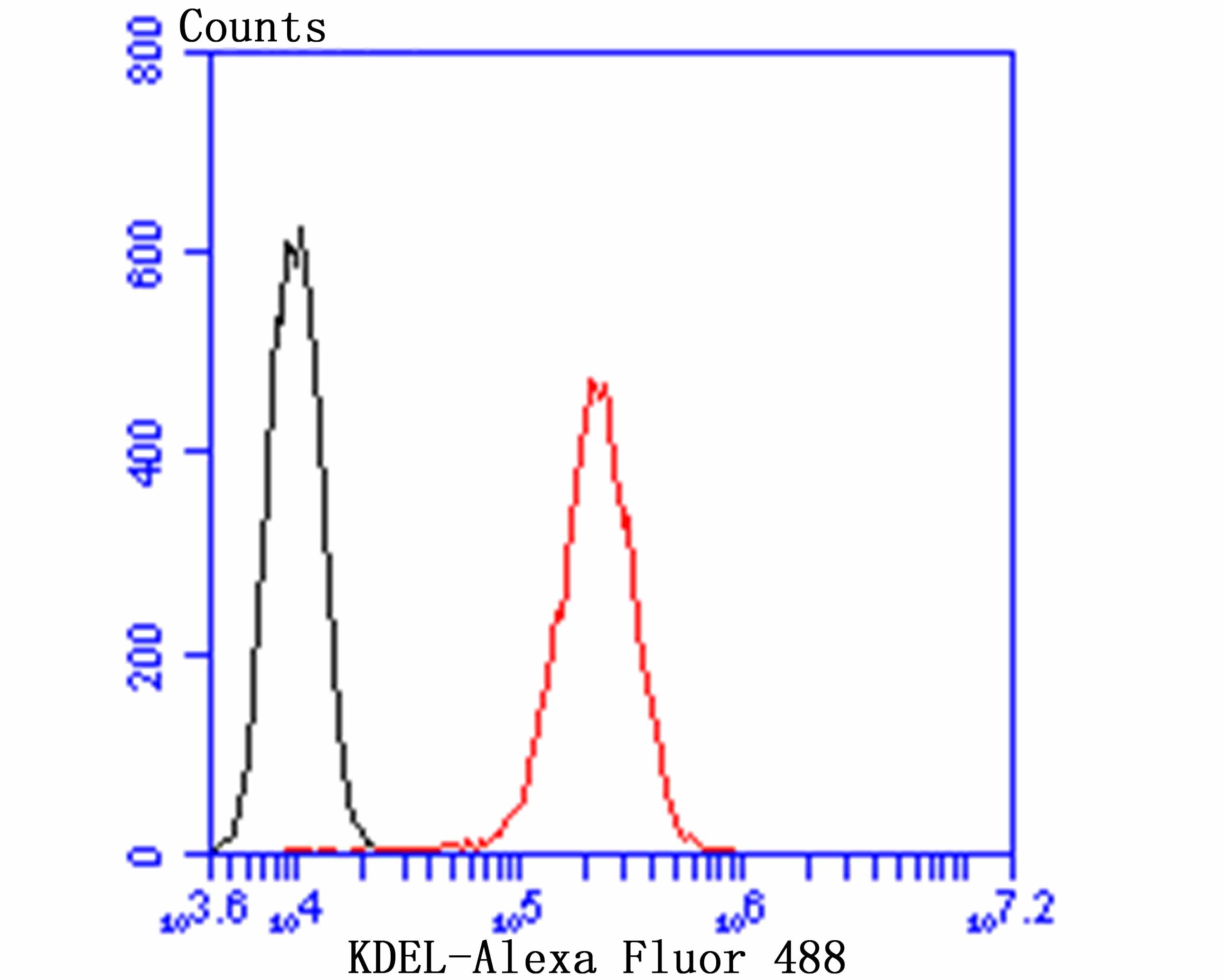 Flow cytometric analysis of HepG2 cells with KDEL antibody at 1/100 dilution (red) compared with an unlabelled control (cells without incubation with primary antibody; black). Alexa Fluor 488-conjugated goat anti rabbit IgG was used as the secondary antibody.