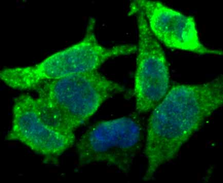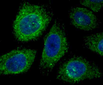 ICC staining KDEL in HepG2 cells (green). The nuclear counter stain is DAPI (blue). Cells were fixed in paraformaldehyde, permeabilised with 0.25% Triton X100/PBS.