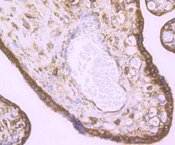 Immunohistochemical analysis of paraffin-embedded human placenta tissue using anti-KDEL antibody. Counter stained with hematoxylin.