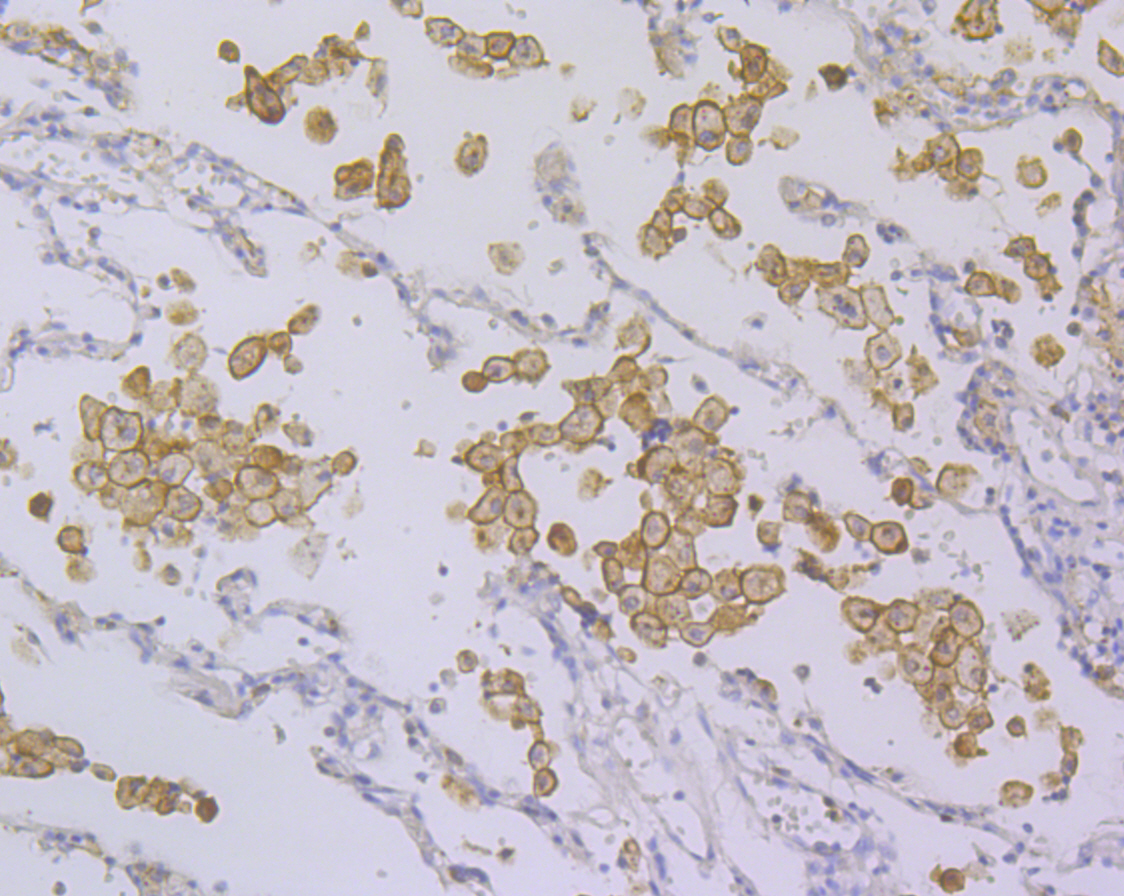 Immunohistochemical analysis of paraffin-embedded human lung cancer tissue using anti-DAP12 antibody. Counter stained with hematoxylin.