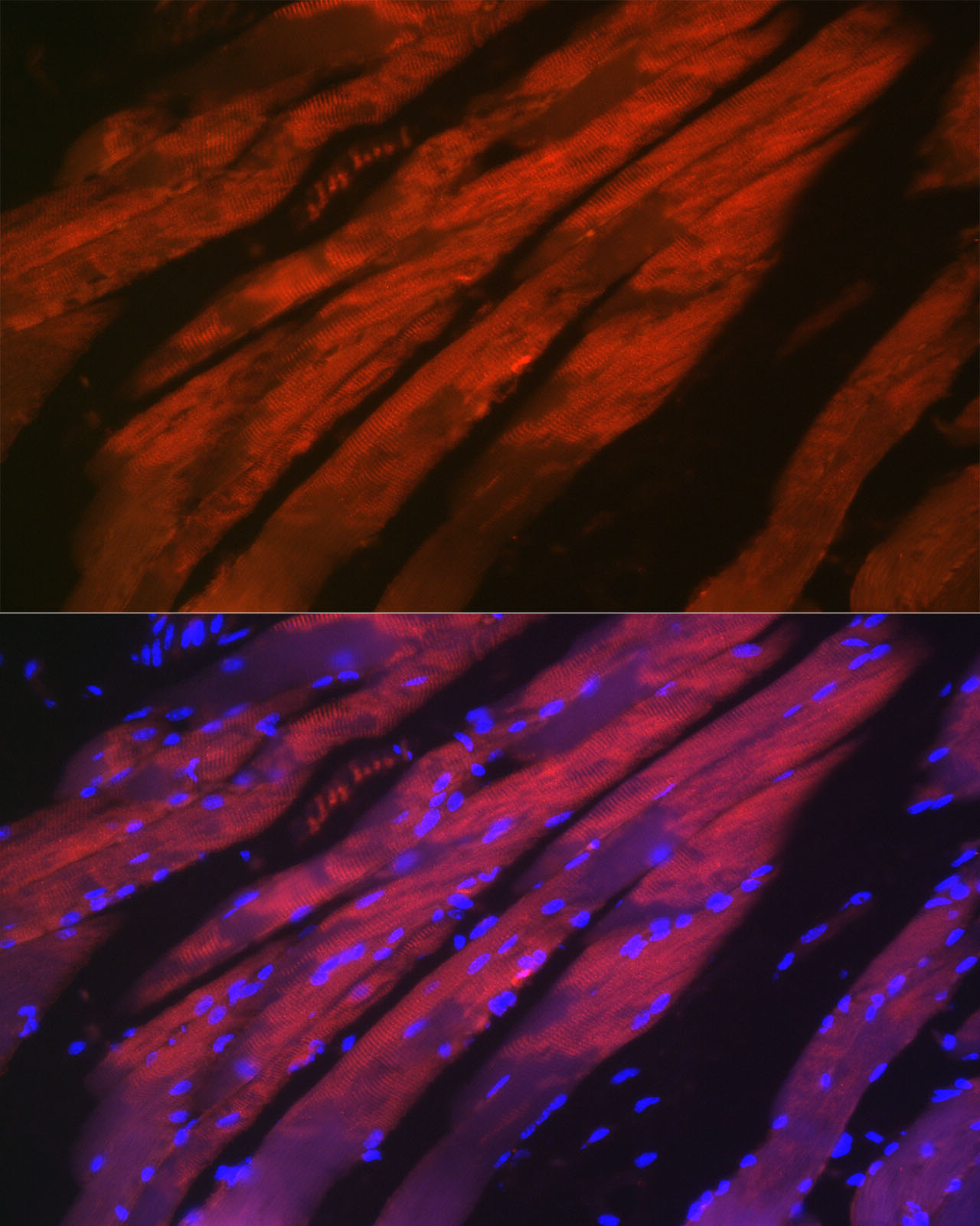 Immunofluorescence analysis of paraffin-embedded rat skeletal muscle using MYH2 at dilution of 1:50 (40x lens).