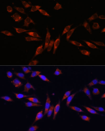 Immunofluorescence analysis of L929 cells using COL4A3 at dilution of 1:100. Blue: DAPI for nuclear staining.
