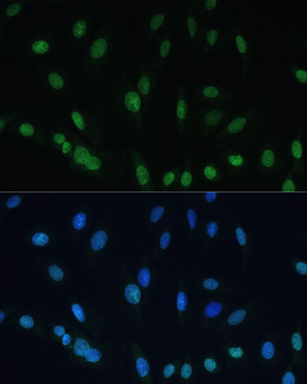 Immunofluorescence analysis of U-2 OS cells using Histone H2A.X Polyclonal Antibody. Blue: DAPI for nuclear staining.