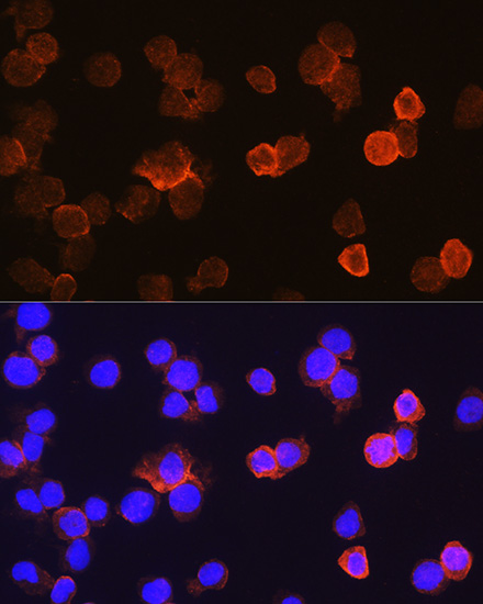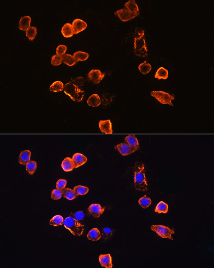 Immunofluorescence analysis of THP-1 cells using CD14 at dilution of 1:100. Blue: DAPI for nuclear staining.
