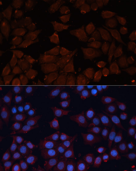 Immunofluorescence analysis of HeLa cells using ADAM12 at dilution of 1:100. Blue: DAPI for nuclear staining.