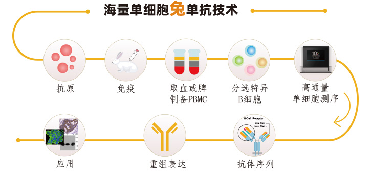 Signalway Antibody 开发创新的海量单细胞兔单抗技术.该技术通过独特的针对兔B细胞的细胞分选技术与细胞表面标记技术将免疫后得到的PBMCs中的特异B细胞分选出来,再通过先进的海量单细胞测序技术,结合个性化的抗体亲和力筛选策略与谱系分析手段,得到V区全长序列进行抗体重组表达。