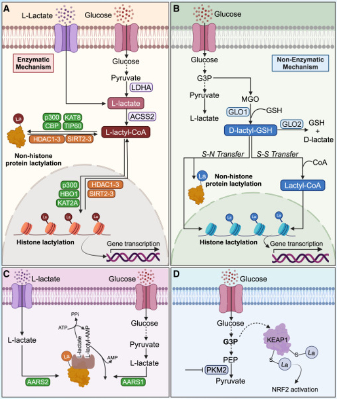 这种修饰可以通过酶促途径(L-lactyl-CoA)或非酶促途径(S-D-lactylglutathione)添加。虽然具体的调节酶是未知的,但现有的乙酰转移酶和去乙酰化酶可能参与其中。